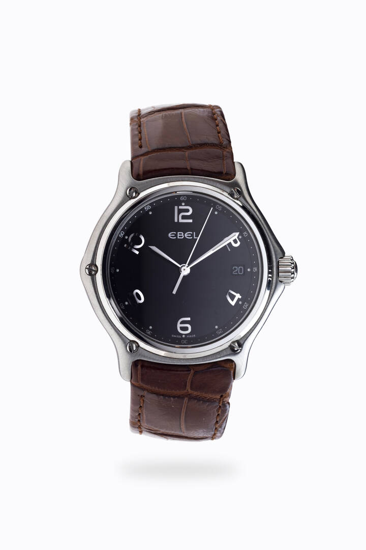 Cassa in acciaio con fondello avvitato. Quadrante nero con numeri arabi applicati, datario al 3 ed indicazione centrale dei secondi continui. Bracciale in pelle con chiusura clasp.