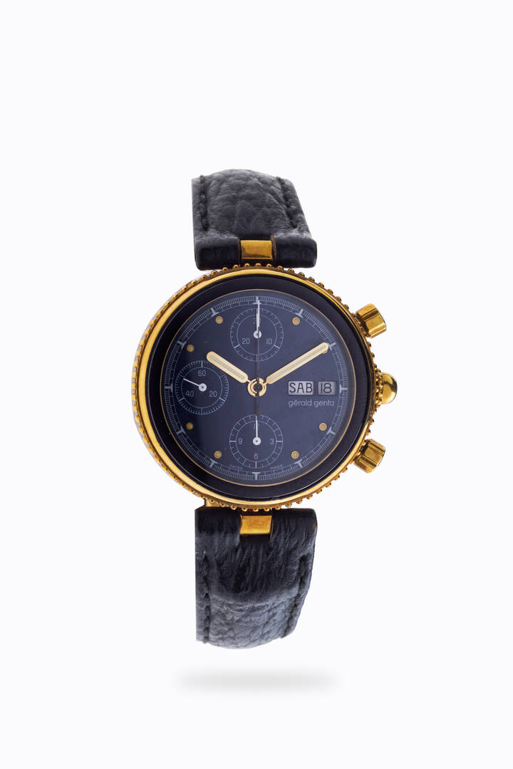 Cassa in oro con lunetta puntinata e fondello a vite. Quadrante antracite con indici geometrici luminescenti e minuteria serigrafata. Presente finestrella della data e del giorno della settimana ad ore 3, sub contatore dei secondi continui al 9, dei 30 minuti al 12 e delle 12 ore al 6.
