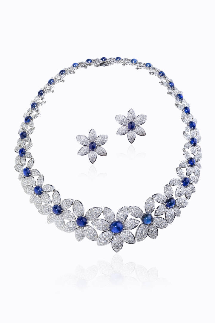 composta da girocollo e coppia di orecchini con fiori in diamanti taglio brillante per totali ct 12,0 ca, probabile colore G-H, purezza IF-VVS e zaffiri cabochon per totali ct 34 ca