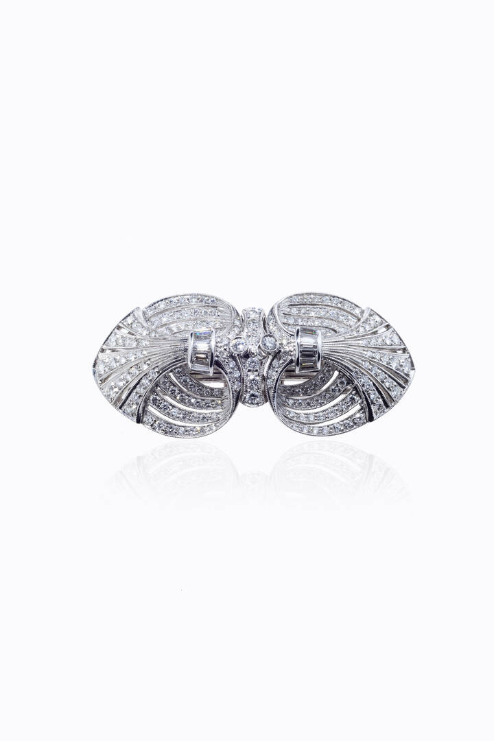in oro bianco, a volute, anni '40, composta da due elementi divisibili in diamanti taglio brillante e baguette per totali ct 1,80 ca