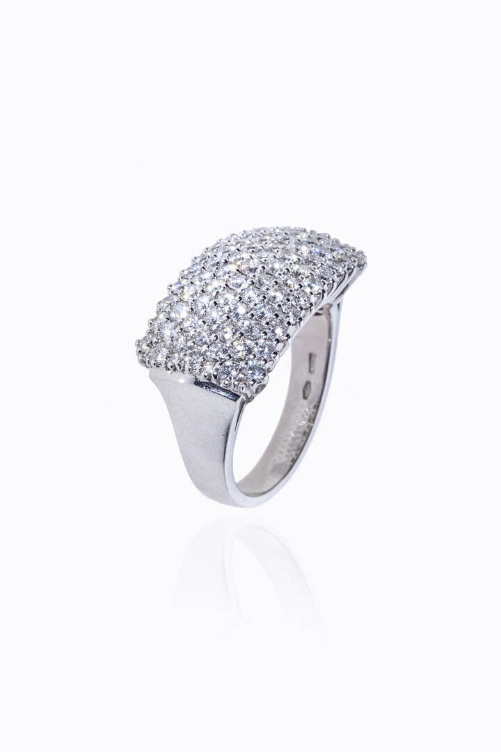 in oro bianco, sommità di forma rettangolare, con pavé di diamanti taglio brillante per totali ct 1,80 ca, probabile colore G-H, purezza IF-VVS