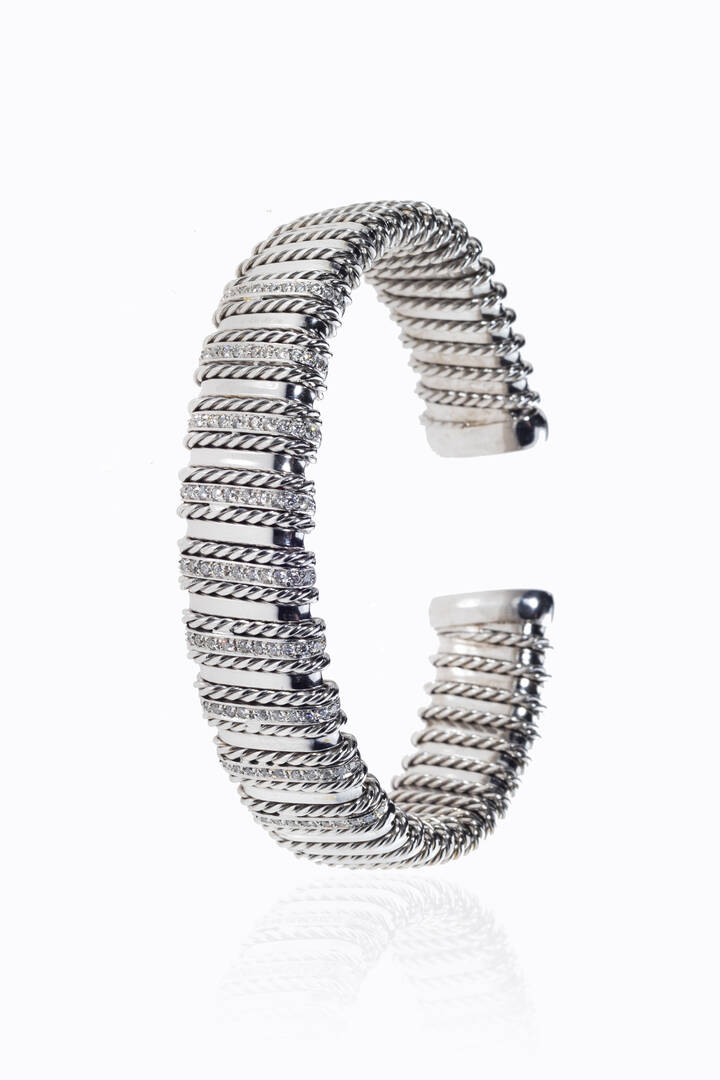 rigido, in oro bianco con inserti lavorati a corda e parte centrale con file di diamanti taglio brillante per totali ct ca1,0 ca