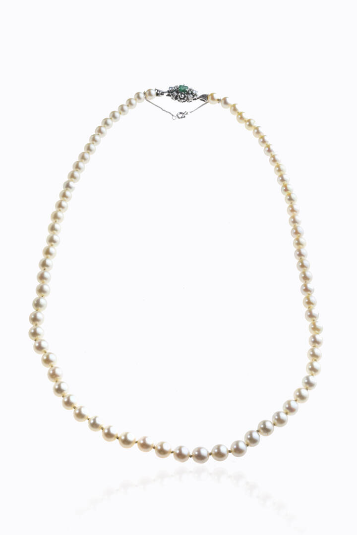 composta da un filo di perle giapponesi del diam. di mm 7-7,5 ca. Chiusura in oro bianco a voluta con smeraldo centrale taglio ottagonale a gradini di ct 0,60 ca e diamanti taglio brillante per totali ct 0,25 ca