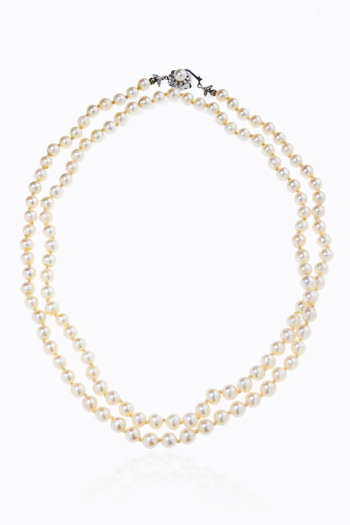 composta da un filo di perle giapponesi scaramazze del diam di mm 6,5-7 ca. Chiusura in oro bianco con diamanti taglio 8/8