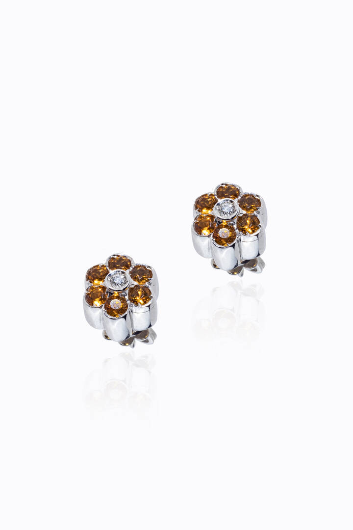 in oro bianco, a lobo, a forma di fiore con citrini taglio rotondo e due diamanti taglio brillante per totali ct 0,05 ca