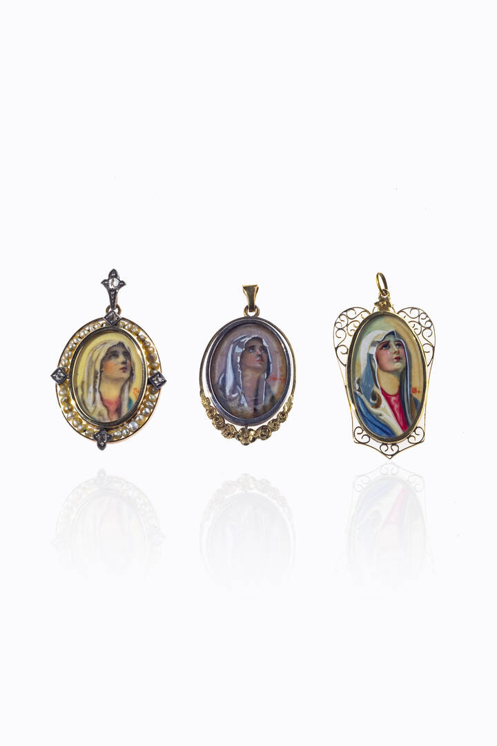 due in oro a bassa caratura, di varia forma e misura con miniature raffiguranti il volto delle Vergine