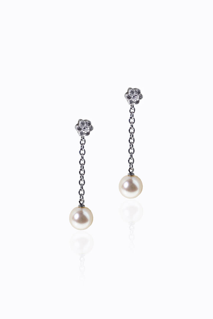 in oro bianco, fiori ai lobi in diamanti taglio brillante per totali ct 0,15 ca, terminanti con due perle giapponesi del diam. di mm 7,5 ca