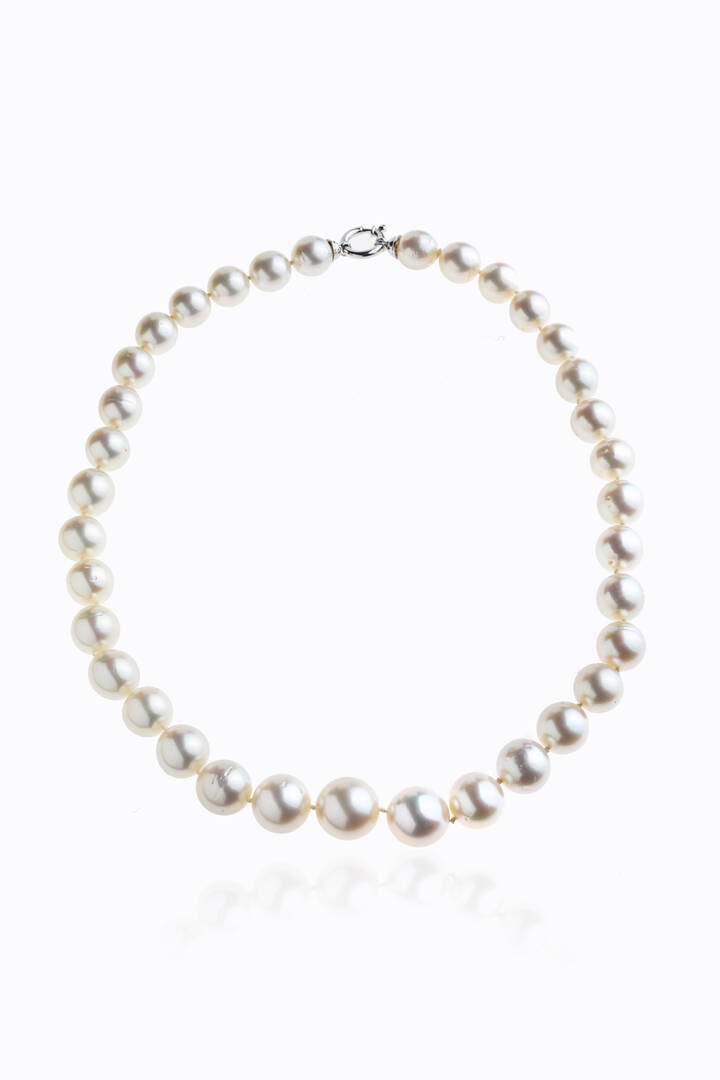 composto da un filo di perle australiane dal diam. di mm 11 a 14,2. Chiusura ad anello in oro bianco