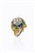 in oro giallo, sommità bombata e lavorata a corteccia, con diamanti taglio brillante per totali ct 1,20 ca, probabile colore G-H, purezza IF-VVS, zaffiri e smeraldi taglio rotondo per totali ct 1,60 ca