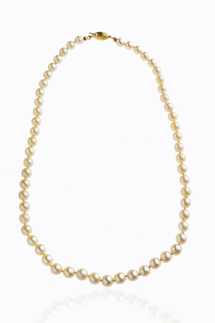 composta da un filo di perle giapponesi del diam. di mm 7-7.5. Chiusura a botte rigata in oro giallo