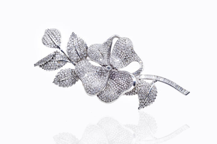 in platino a forma di ramo fiorito con diamanti taglio 8/8 per totali ct 10,0 ca, probabile colore G-H, purezza IF-VVS (due mancanti)