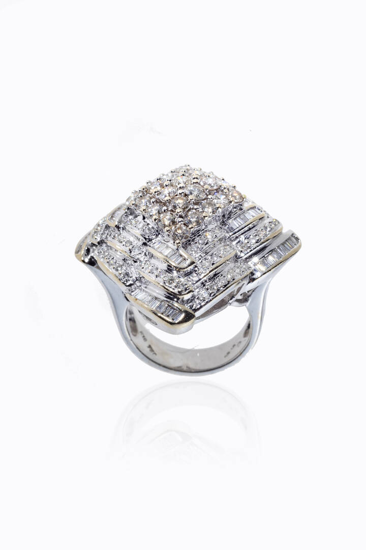 in oro bianco, sommità romboidale, con diamanti taglio brillante, baguette e trapezio per totali ct 4 ca