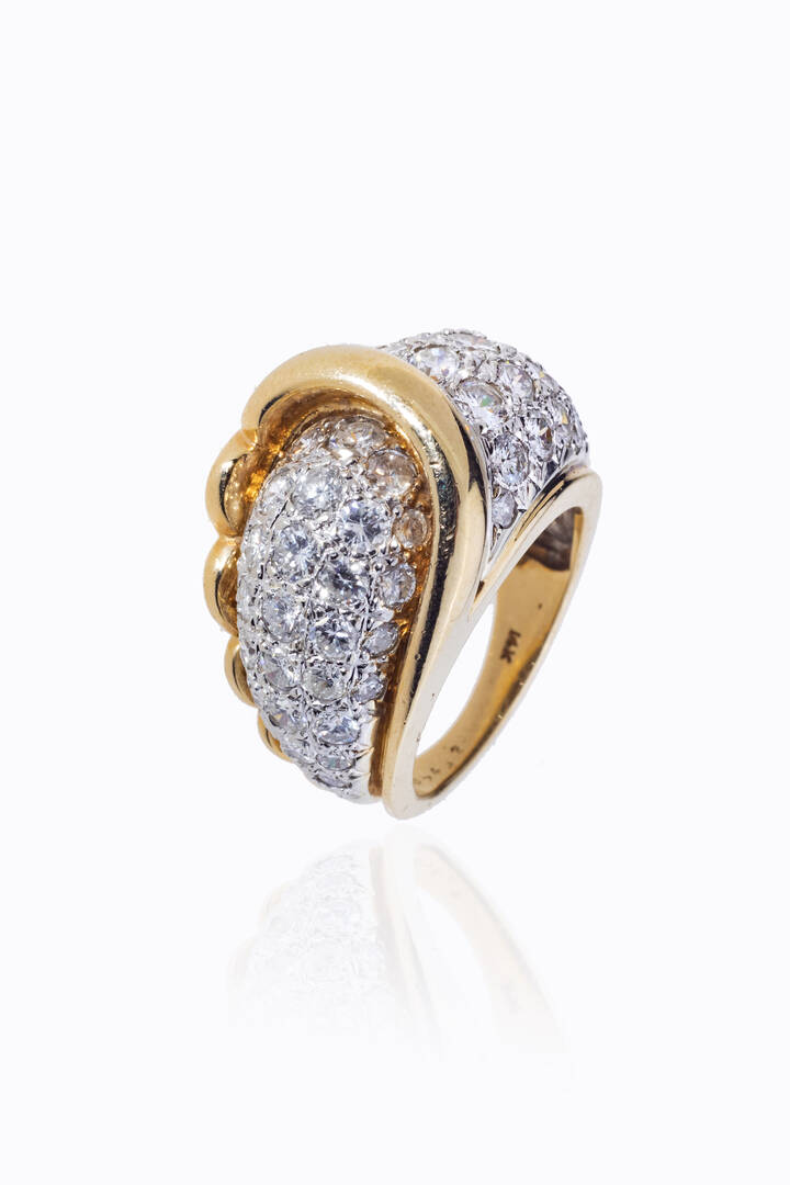 in oro rosa, sommità in oro bianco, a cupola con pavé in diamanti taglio brillante per totali ct 3,50 ca, probabile colore G-H, purezza IF-VVS