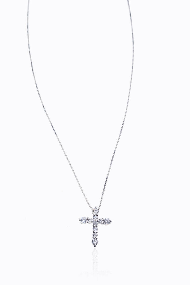 in oro bianco, a forma di croce, con diamanti taglio brillante per totali ct 0,14 ca, probabile colore G-H, purezza IF-VVS