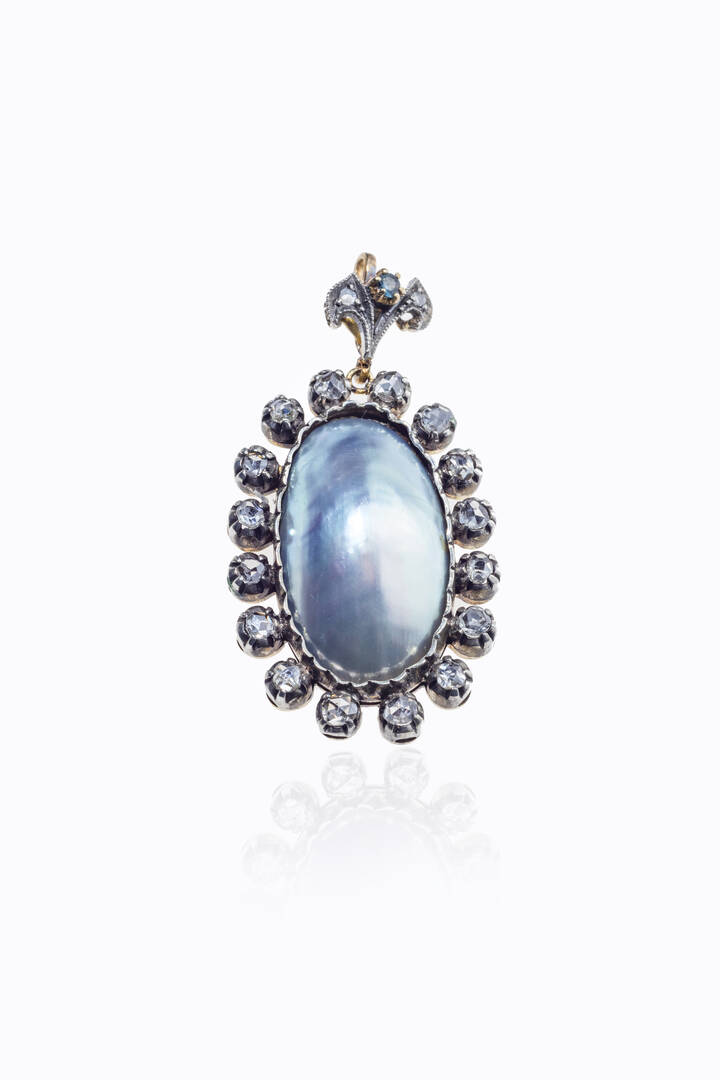 in oro giallo a bassa caratura ed argento, con grande perla mabé ovale e rosette di diamanti a contorno per totali ct 2,30 ca