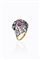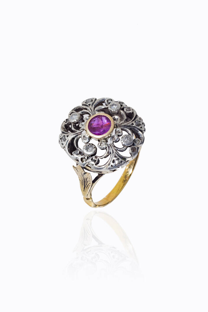 in oro giallo a bassa caratura ed argento, XIX secolo, sommità rotonda a volute con al centro un rubino taglio rotondo di ct 0,35 ca e diamanti taglio brillante per totali ct 0,20 ca