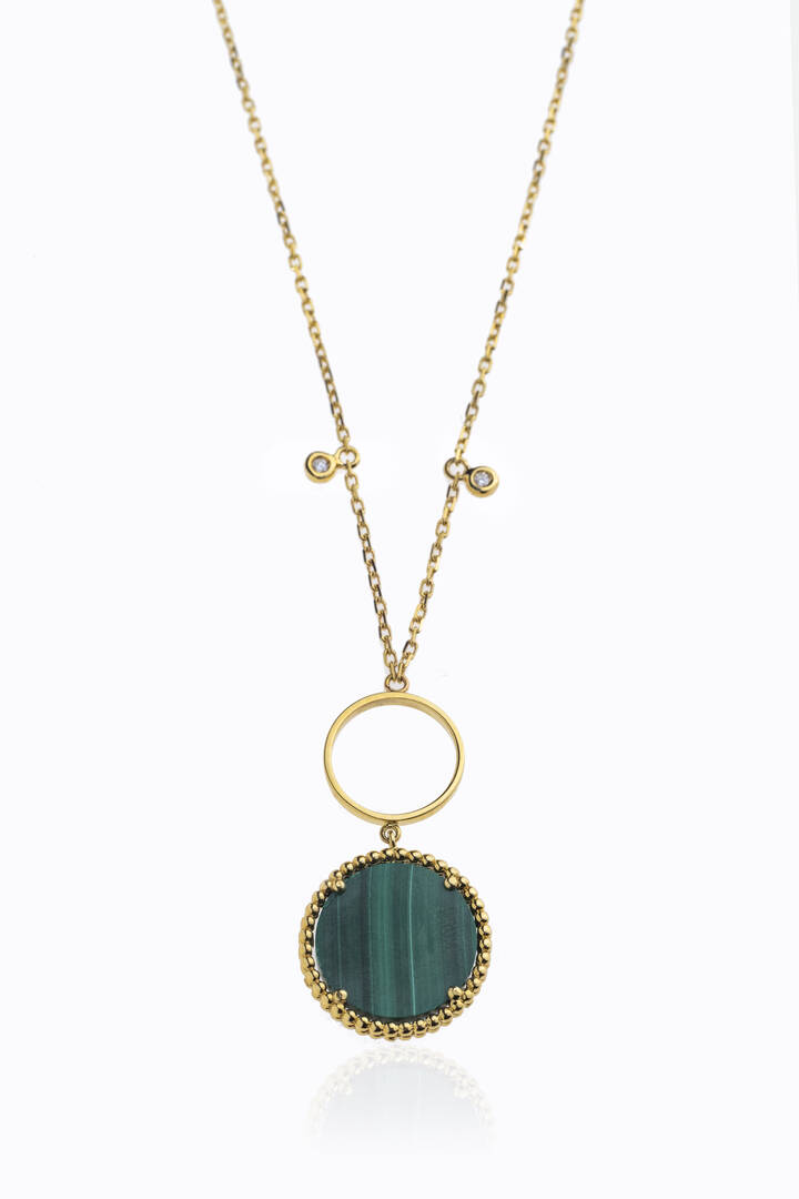 in oro giallo con disco in malachite e diamanti taglio brillante per totali ct 0,04 ca, probabile colore G-H, purezza IF-VVS