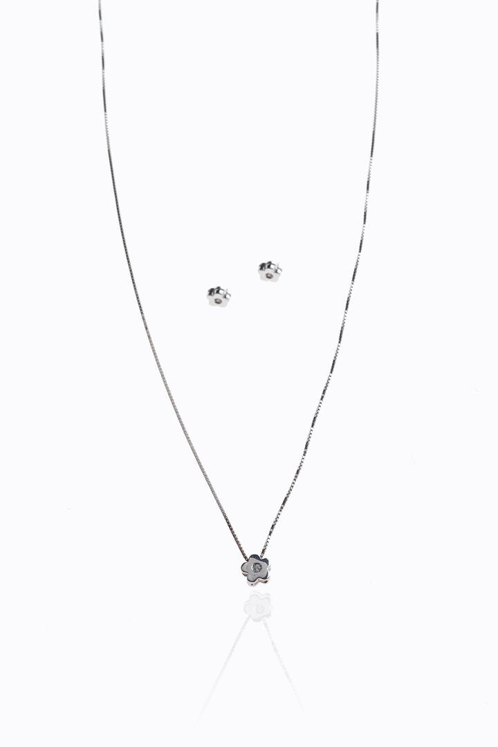 composta da coppia di orecchini e catena con ciondolo a forma di fiore stilizzato con diamanti taglio brillante per totali ct 0,03 ca, probabile colore G-H, purezza IF-VVS