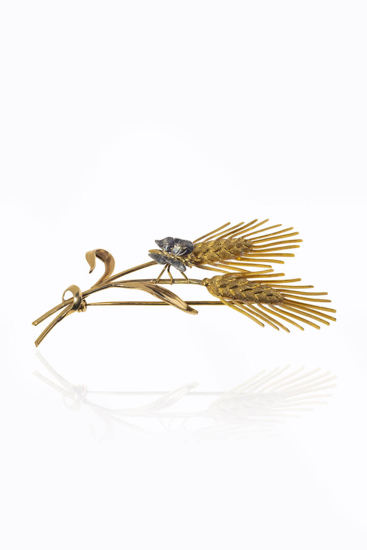 in oro giallo con due spighe di grano ed una farfalla in oro bianco