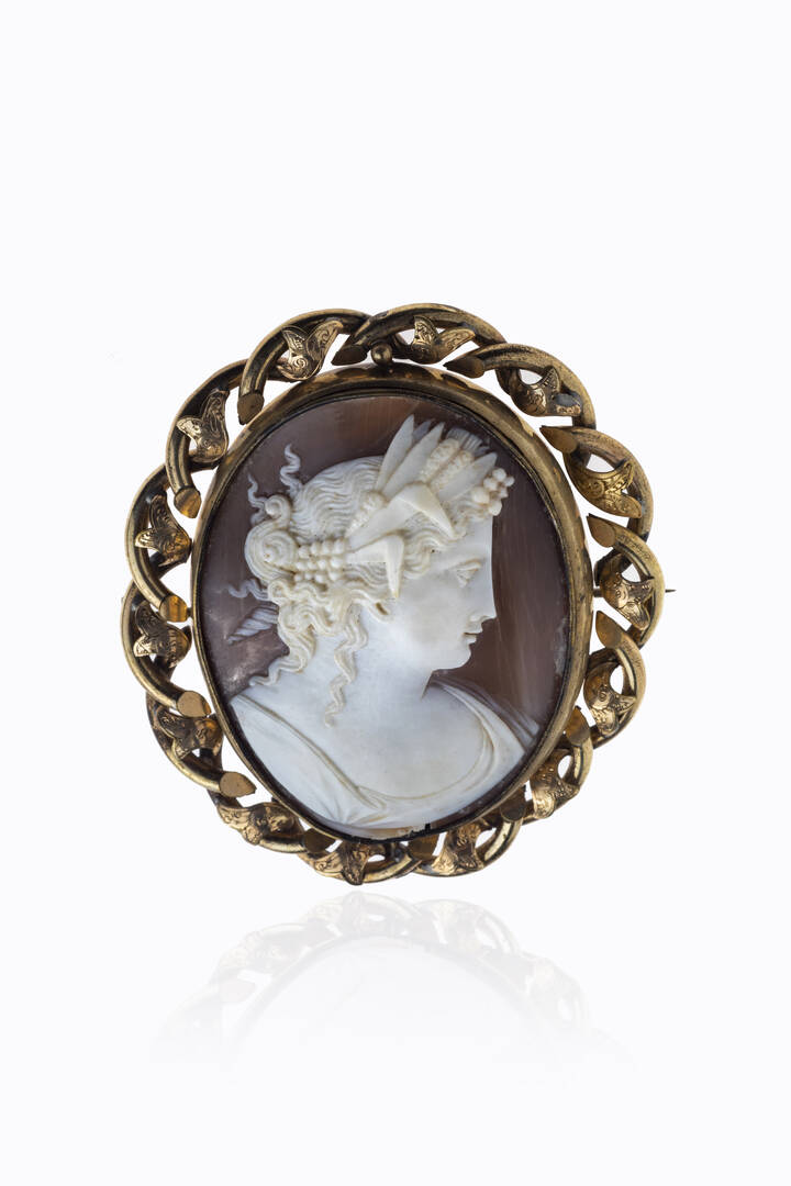 XIX secolo, raffigurante la dea Cerere di profilo; montato su metallo dorato e lavorato a volute. Al retro presenta vano porta capelli