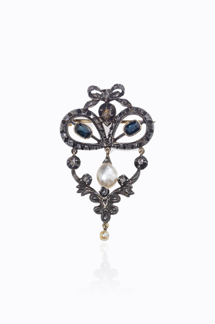 in oro rosa a bassa caratura ed argento, XIX secolo, a volute con due zaffiri taglio ovale; rosette di diamanti e due perle (mancanze)