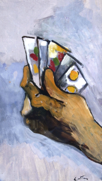 "Giocatore di carte" Olio su tela cm. H: 40.00 L: 24.00 Firma in basso a destra. Autentica al retro a firma di Marta Marzotto. Ulteriore garanzia di autenticità e legittima provenienza a cura del Centro Arte Mercurio (Milano).