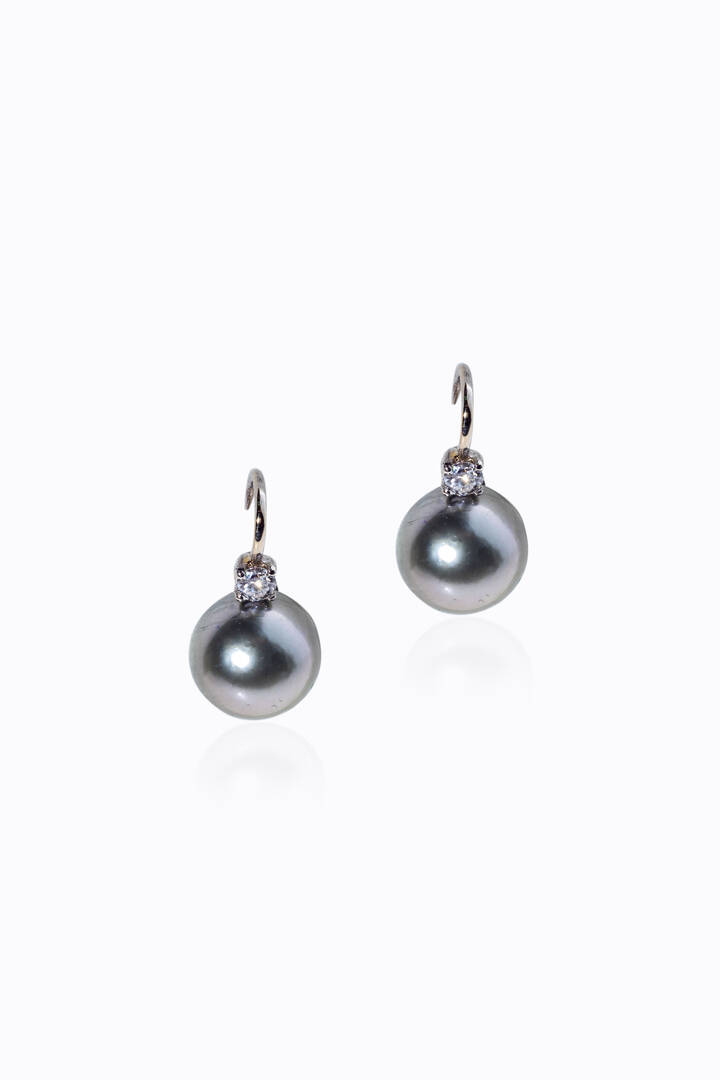 in oro bianco, a monachella, con due perle Tahiti nei toni del grigio chiaro del diam. di mm 10 ca, sormontate da due diamanti taglio brillante per totali ct 0,23 ca