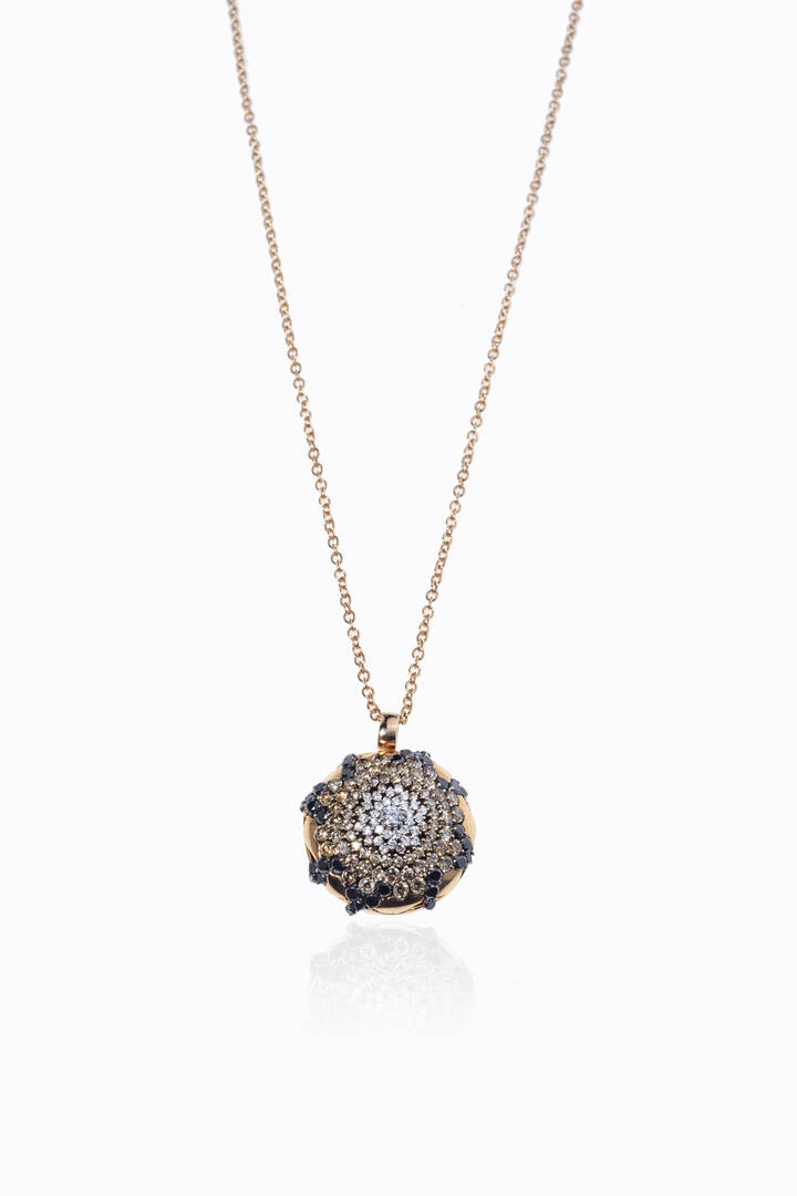 in oro rosa, a di forma rotonda, con decoro floreale in diamanti taglio brillante di colore, bianco, nero e cognac per totali ct 2,19 ca, probabile colore G-H, purezza IF-VVS