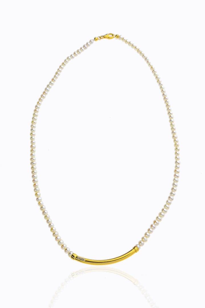 composto da un filo di perline di acqua dolce del diam. di mm 3,5. Chiusura e inserto centrale in oro giallo