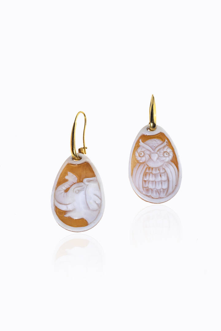 in oro giallo, ad amo, con due cammei incisi raffiguranti l'immagine portafortuna di un gufo e di un elefante