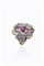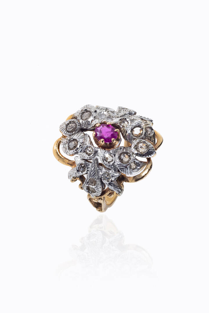 in oro rosa e bianco14 Kt , sommità a volute, al centro rubino centrale di ct 0,35 ca, e rosette per totali ct 0,40 ca