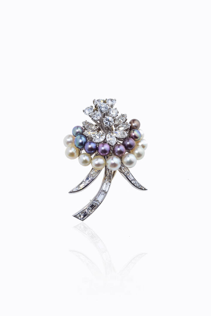 in oro bianco, a forma di fiore con due file di perle giapponesi bianche e colorate nei toni del nero del diam. di mm 5,0 ca; diamanti taglio brillante, navette e baguette ct 3,30 ca