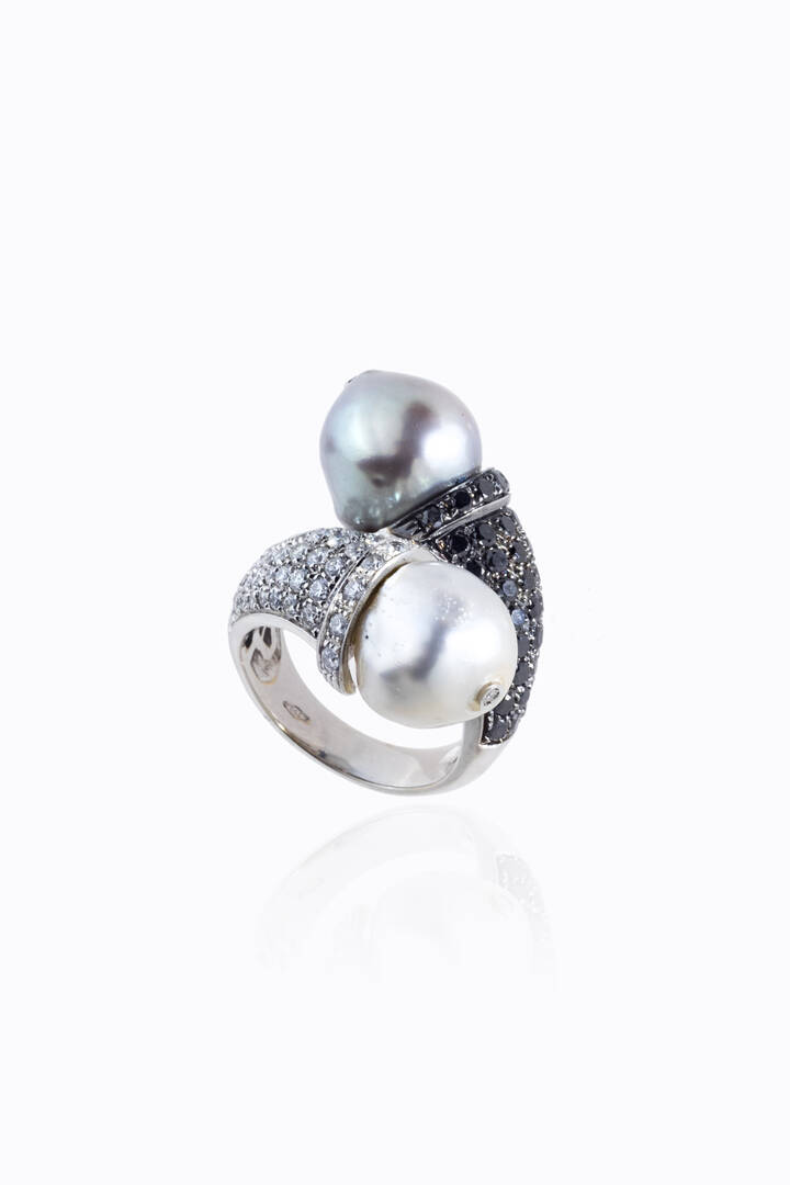 in oro bianco, modello contrarié, con due perle scaramazze nei toni del grigio del diam. di mm 11,3 e 11,5; diamanti neri e bianchi taglio brillante a decoro per totali ct 3,30 ca