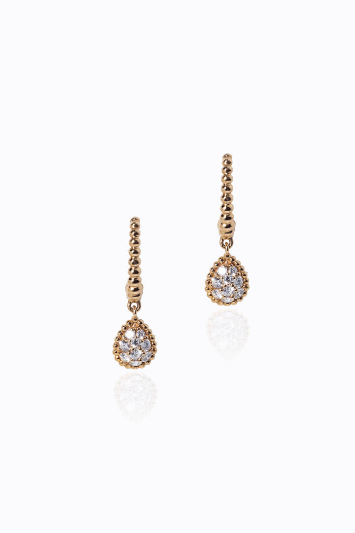 in oro rosa, a monachella, con gocce lavorate a grani con diamanti taglio brillante per totali ct 0,44 ca, probabile colore G-H, purezza IF-VVS