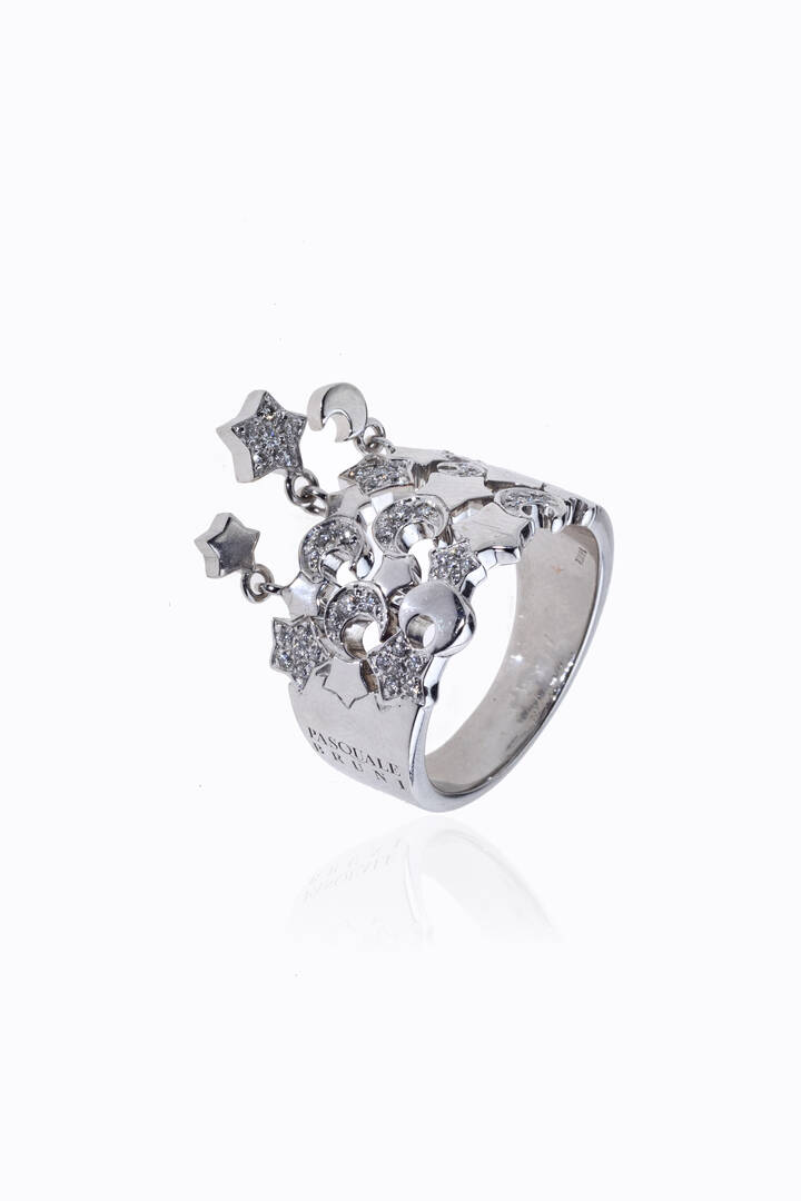 Anello in oro bianco, a fascia, sommità con lune, cuori e stelle con diamanti taglio brillante per totali ct 0,35 ca
