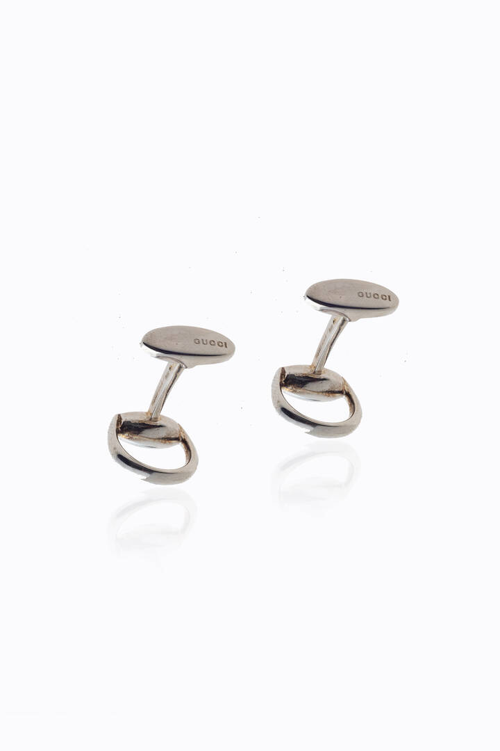 Coppia di gemelli in argento 925/1000, firmati "Gucci", a forma di staffa