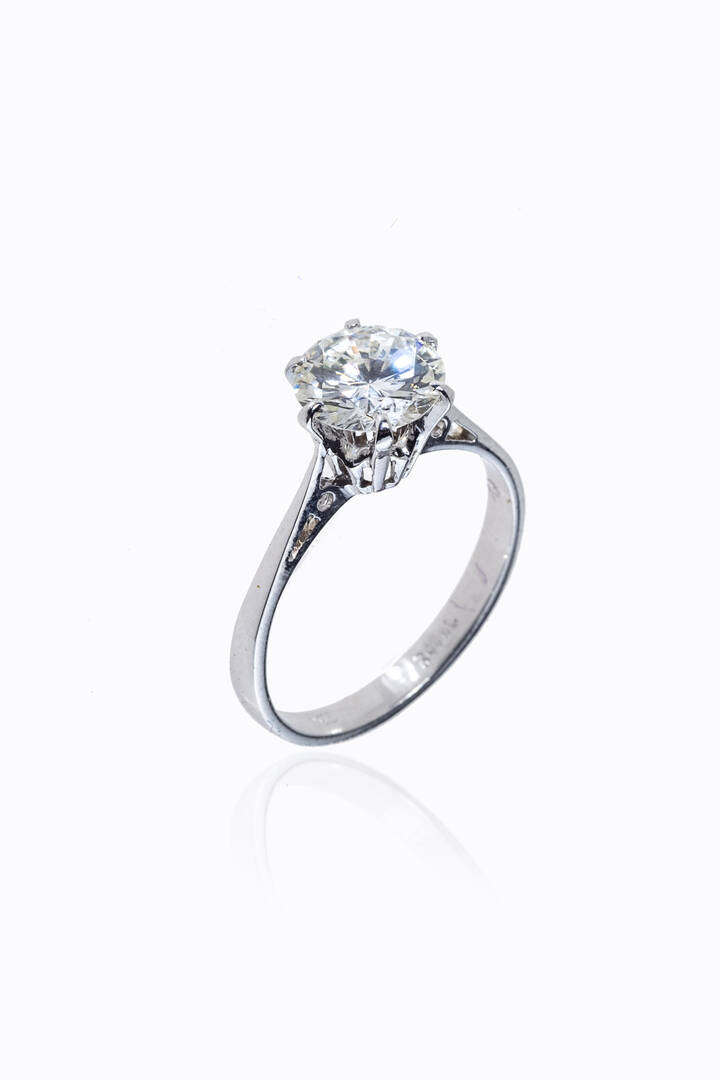 in oro bianco con diamante solitario taglio brillante di ct 1,50 ca, probabile colore J-K, purezza VVS
