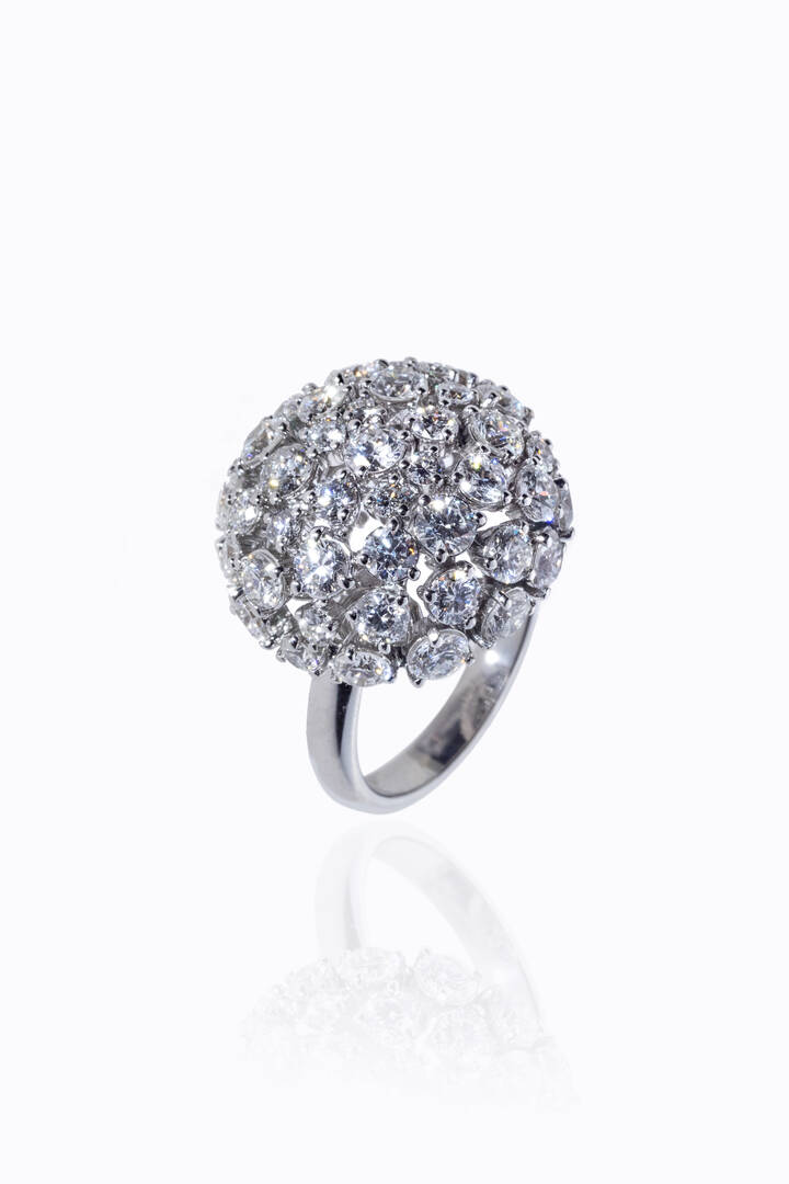 in oro bianco, sommità a semisfera con diamanti taglio brillante per totali ct 4,70 ca, probabile colore G, purezza IF-VVS