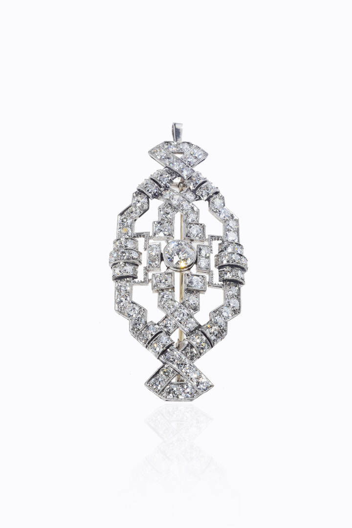 Spilla in platino, anni 1920-30, con diamanti taglio brillante di vecchio taglio e 8/8 per totali ct 3,50 ca