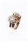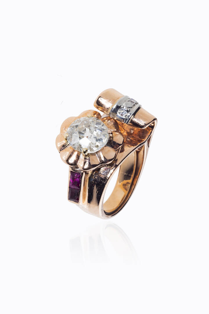 in oro rosa, anni '40, con volute laterali recanti fila di rubini taglio carré per totali ct 0,50 ca e un diamante taglio brillante di vecchio taglio di ct 2,15 ca; piccoli diamantini a decoro