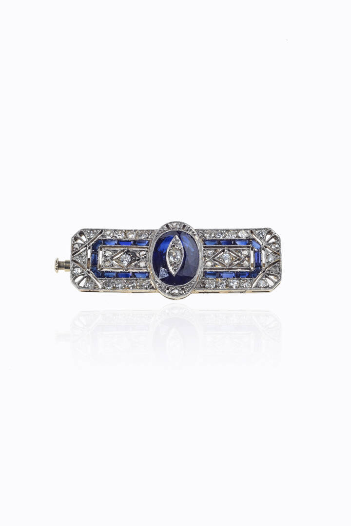 in oro bianco, inizi XX secolo, di forma geometrica con zaffiri taglio carré sintetici e diamanti taglio 8/8 e rosette per totali ct 0,40 ca
