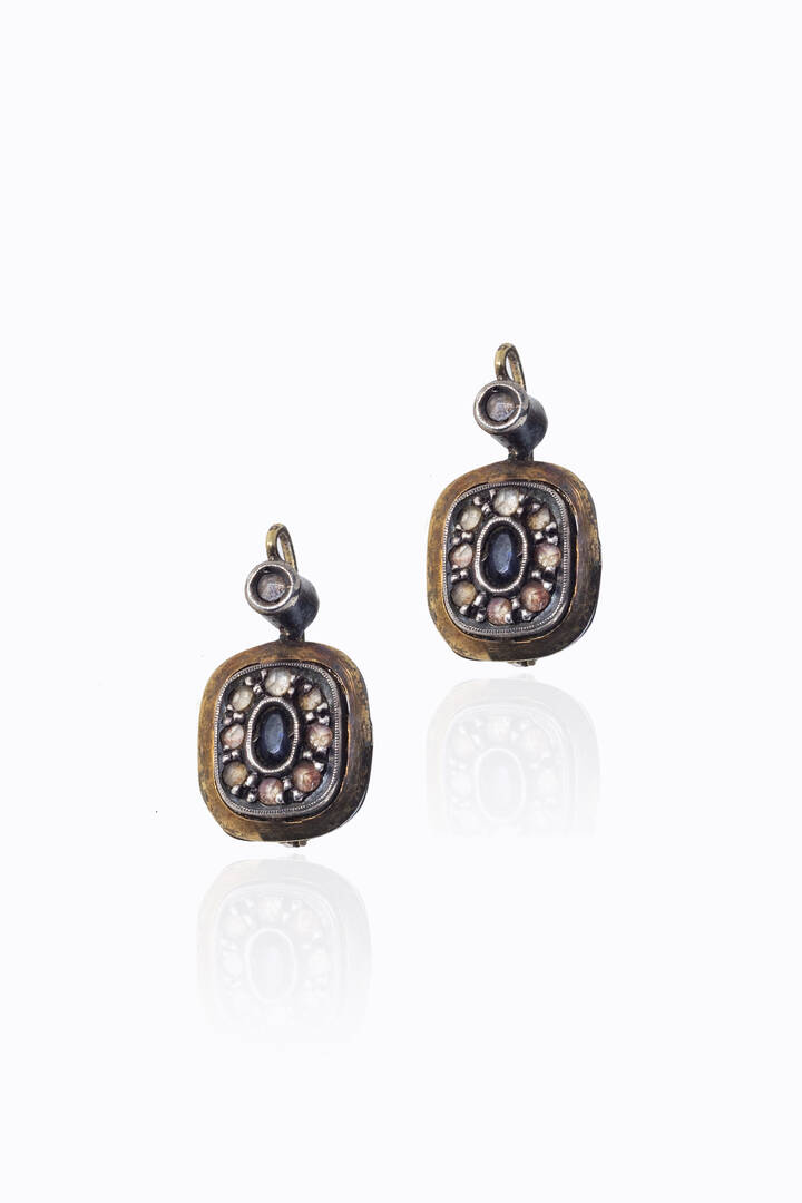 in oro a bassa caratura ed argento, a monachella, XIX secolo, con due zaffiri taglio ovale e rosette di diamanti