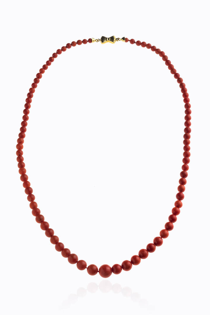 composta da un filo di sfere di corallo mediterraneo a scalare dal diam. di mm 11,3 a 6. Chiusura in oro giallo a fiocco