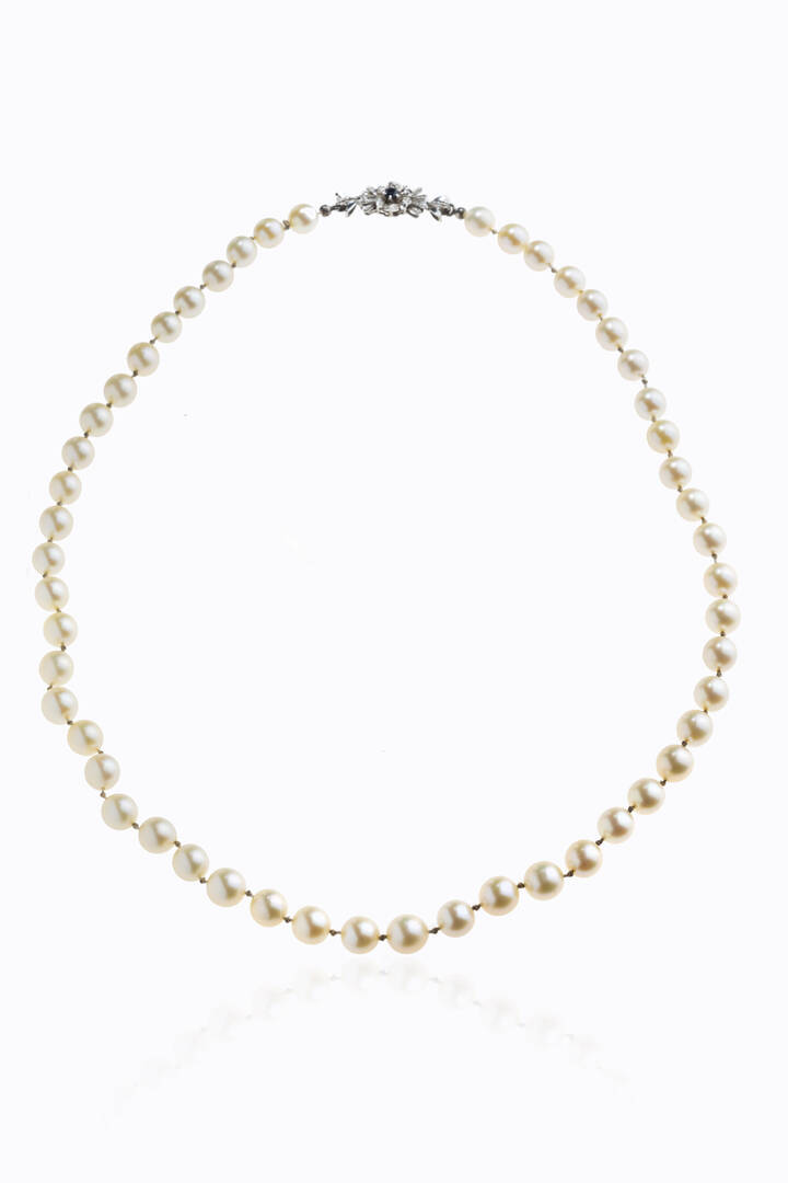composto da un filo di perle giapponesi del diam. di mm 7,5. Chiusura in oro bianco con uno zaffiro taglio rotondo