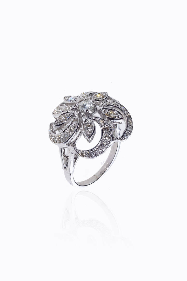 in oro bianco, sommità a motivo floreale, con diamanti taglio brillante per totali ct 0,75 ca