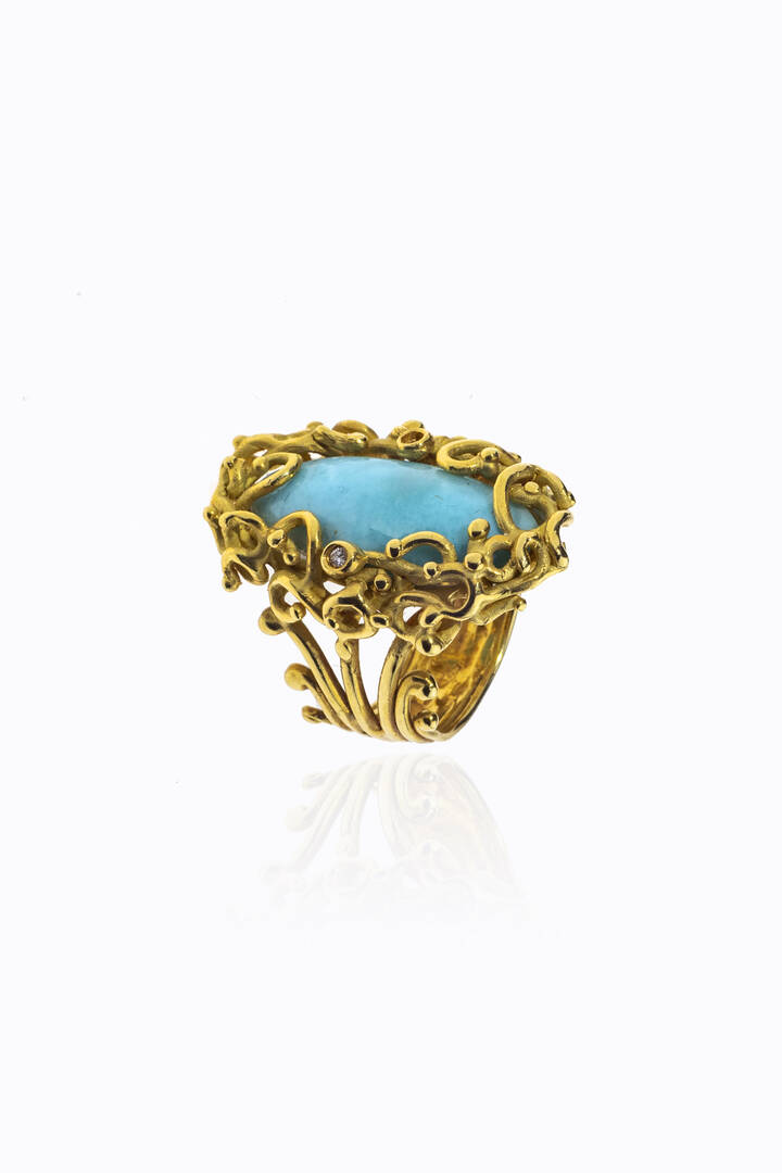 in oro giallo, lavorato a volute, al centro losanga in avventurina taglio cabochon