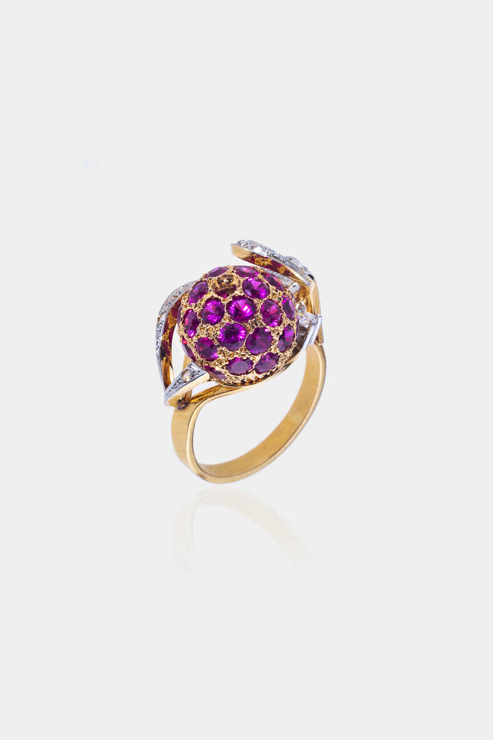 in oro rosa e bianco, sommità a sfera in rubini sintetici (uno mancante) e nastri con rosette di diamanti taglio brillante per totali ct 0,15 ca