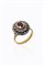 in oro giallo ed argento, in stile, sommità ovale con al centro rubino taglio ovale di ct 1,0 ca e doppio contorno di rosette per totali ct 0,40 ca