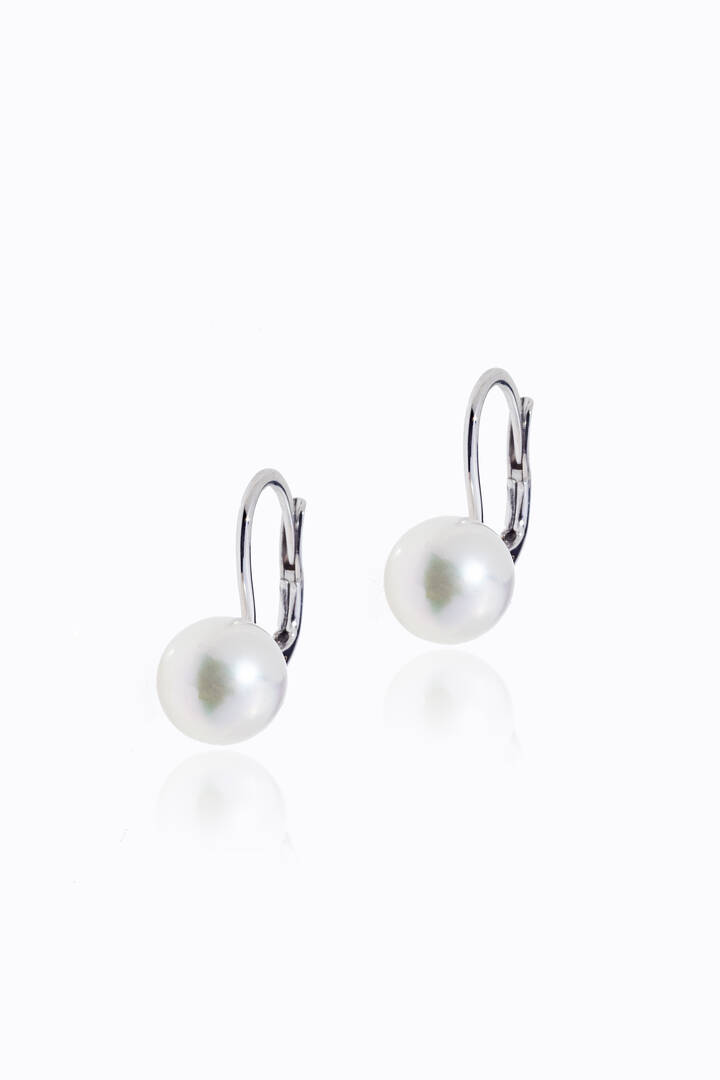 in oro bianco, a monachella, con due perle giapponesi del diam di mm 8,5 ca