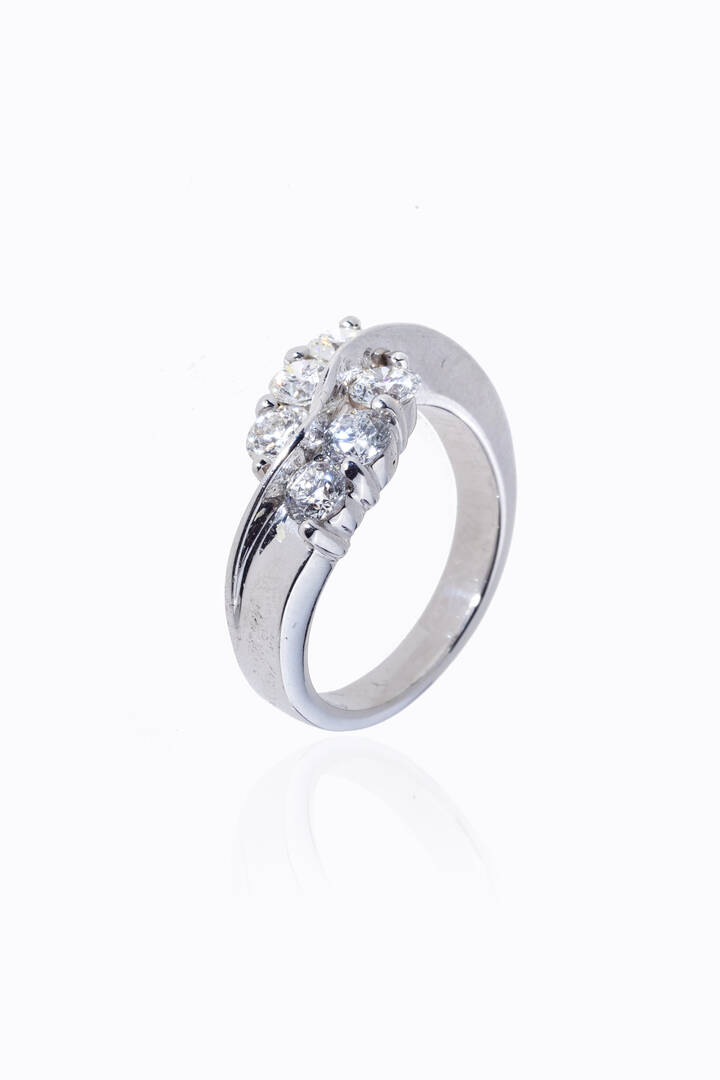 in oro bianco, modello contrarié con sei diamanti taglio brillante per totali ct 1, 0 ca probabile colore G-H, purezza IF-VVS